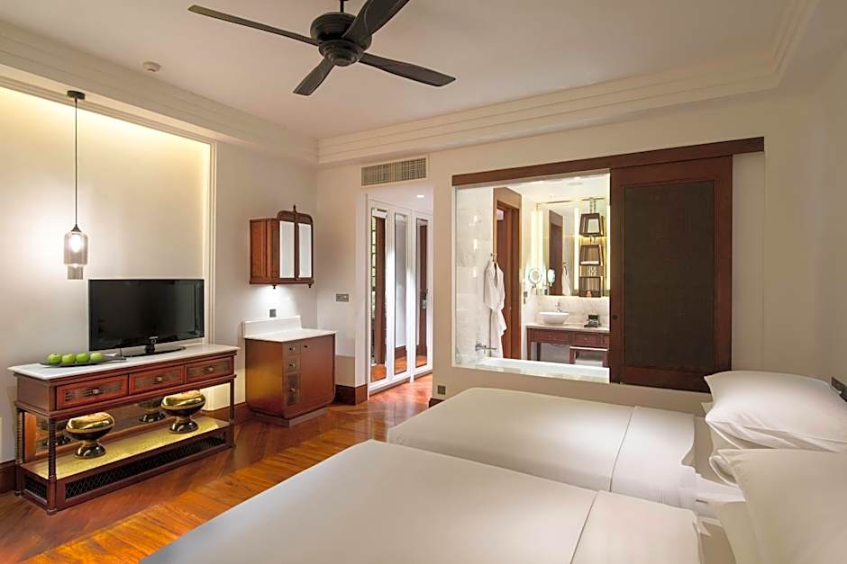 Offering city views of Siem Reap, the air-conditioned room features Khmer-inspired contemporary art, custom furniture and summery decor. Room includes a flat-screen satellite TV with DVD player, a fully-integrated media hub, a Nespresso coffeemaker and welcome fruits upon arrival. It also comes with a private bathroom that features Italian marble flooring, an alcove tub, a separate shower area with a rainfall shower head, dual vanities and luxury amenities by Cochine.