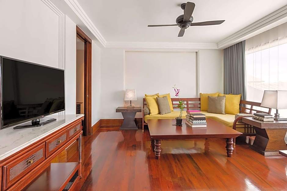 Inspired by the colors of summer and contemporary Khmer art decor, this air-conditioned suite opens up to views of the city. The separate living area fitted with custom furniture. It comes equipped with a flat-screen TV with satellite channels, a DVD player, a fully integrated media hub and a Nespresso coffee machine. The private bathroom has Italian marble flooring, a soaking tub, a separate shower area with a rainfall shower head, dual vanities and amenities by Cochine.